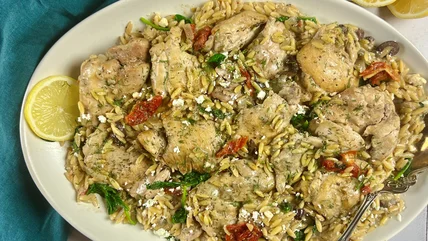 - Add orzo to a platter. Top with chicken and garnish with more dill, if desired, to serve.