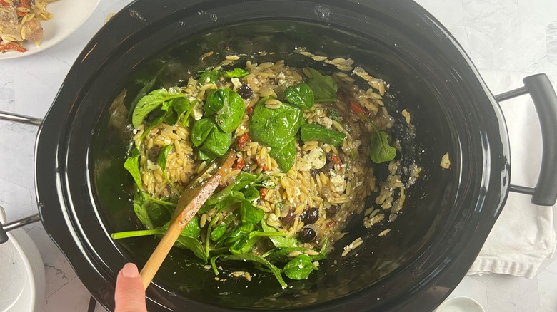 - Add orzo, olives, and sun-dried tomatoes to the slow cooker. Stir well to ensure that the orzo is submerged in chicken stock. Continue cooking on high for 30 minutes.