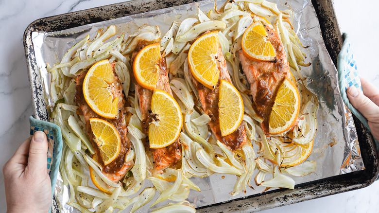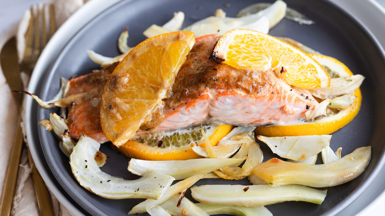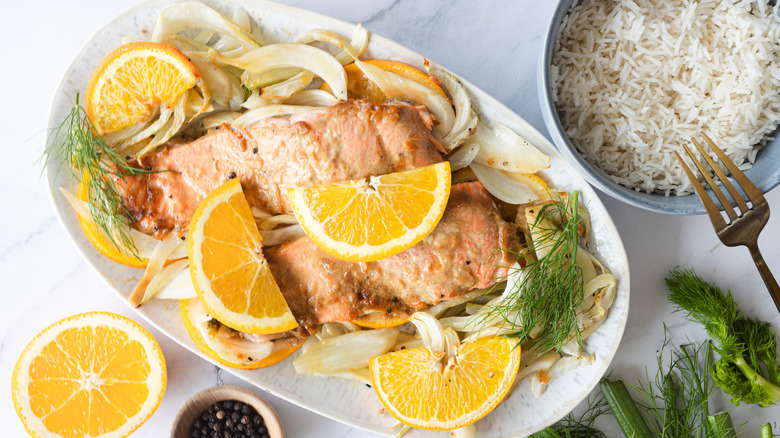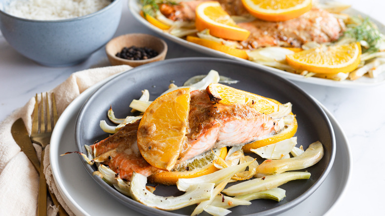 According to Ksenia Prints of At the Immigrant's Table, salmon pairs wonderfully with sweet and acidic flavors. The orange marmalade topping provides the perfect balance of sweet and tart to complement the fish. While the salmon bakes, the fennel slices roast alongside it, lending their anise-like fragrance to every bite. In just over 30 minutes, you can have a complete meal with protein, vegetables, and fruit ready to enjoy. You can pair it with some rice, simple pasta, or a baguette if you want something to mop up all those delicious juices.