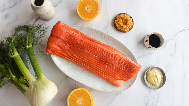 Gather the ingredients for orange marmalade salmon with roasted fennel