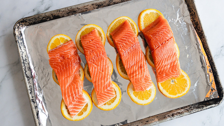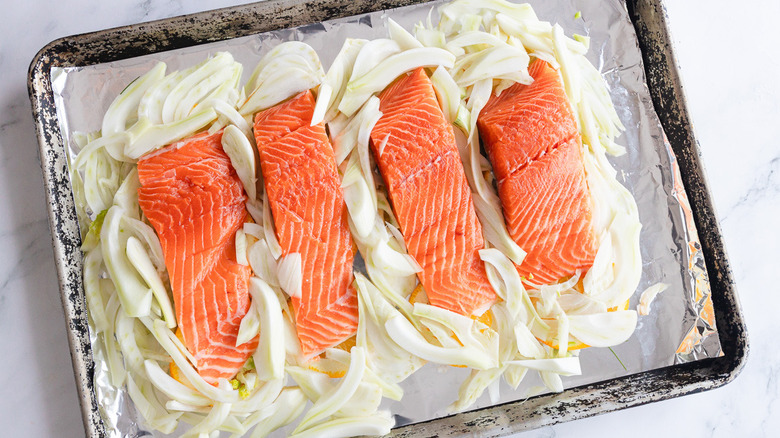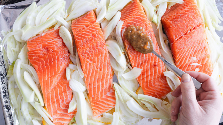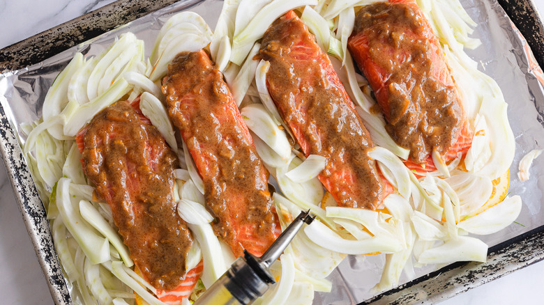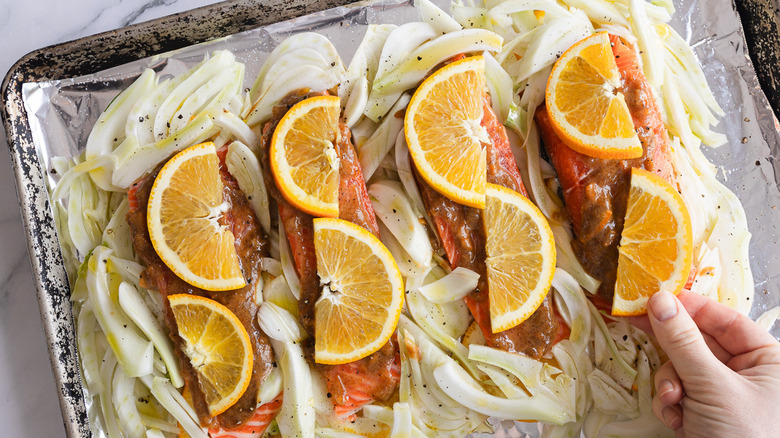 If you don't have fresh fennel bulbs on hand, or you're not big on licorice flavors, there are a couple of suitable vegetable swaps you can make to still get a nice contrast to the sweet marmalade. Thinly sliced sweet potatoes would be a great option, adding softness and sweetness underneath the fish. Apple slices would also work, lending a subtle sweetness and moisture. You can also take the dish in a more Asian direction, pairing the salmon with baby bok choi. The anise-like flavor from the fennel would be missing, but the dish would still be tasty with sweet potatoes or apples in its place. If you're looking for a more filling side, you can use halved fingerling potatoes, as well. You may want to increase the cooking time slightly to ensure that the vegetable slices soften fully if substituting for the fennel — we recommend starting to cook the dish without the fish if using potatoes or sweet potatoes and adding the fish after about 15 minutes to avoid overcooking it.