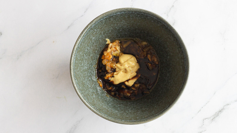 - In a small bowl, mix together the marmalade, soy sauce, olive oil, and Dijon mustard.