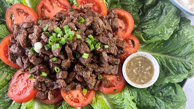 In addition to the steak, you'll also need chicken stock, cornstarch, soy sauce, oyster sauce, tomato paste, fish sauce, brown sugar, and Kampot peppercorns for the marinade, as well as vegetable oil for stir-frying. Once cooked, the beef will be accompanied by a sauce made from lime juice, salt, garlic, and granulated sugar, plus a platter of jasmine rice, romaine lettuce, scallions, and sliced tomatoes.