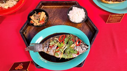 Just like the steamed fish itself, the red Fresno chilies, fresh ginger, and cilantro are all new additions to the dish this year. Each of those aromatics has its own strong flavor. But Aguayo believes it's the hot black vinegar sauce ladled over the top of the tilapia that truly makes the aromatics shine. The end result is a dish that Aguayo says is "really delicious. Something that I'm not totally used to but really enjoy."