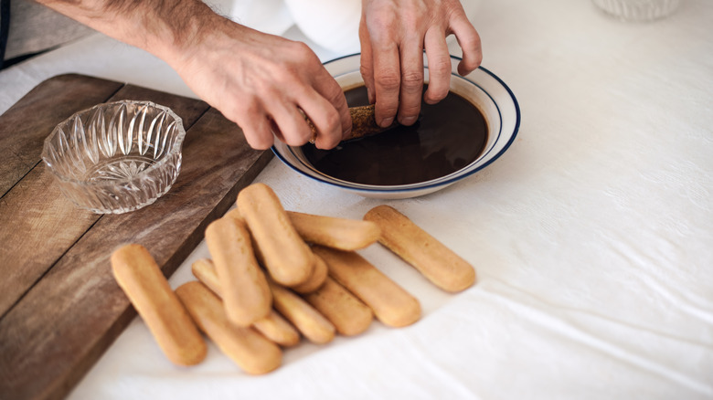Once you have your espresso ready, make sure to dip, coat, and subsequently remove your ladyfingers from the liquid. You want the espresso flavor — with none of the sogginess.