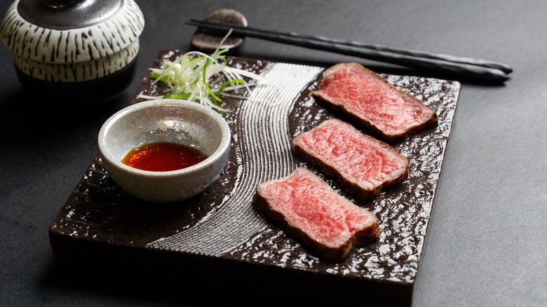 Japanese spices like ground sansho peppercorns or shichimi togarashi imbue an initial bright dose of flavor, that quickly subsides to showcase the meat. Further complements may also include dollops of pastes, like wasabi, mustard, or citrusy yuzu kosho. And sometimes, there's a dipping sauce, oftentimes soy-based. Diners then create their own bite pairings, matching richly flavored meats with bright, bold flavors. Such a dining style creates a do-it-yourself flavor experience as opposed to American-style plated steak meals.