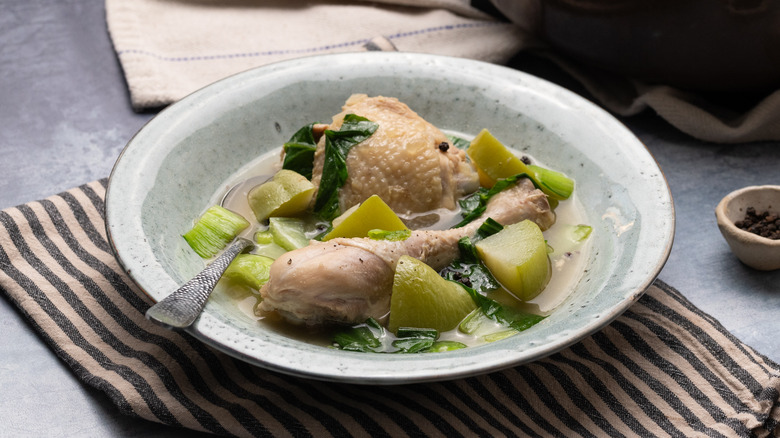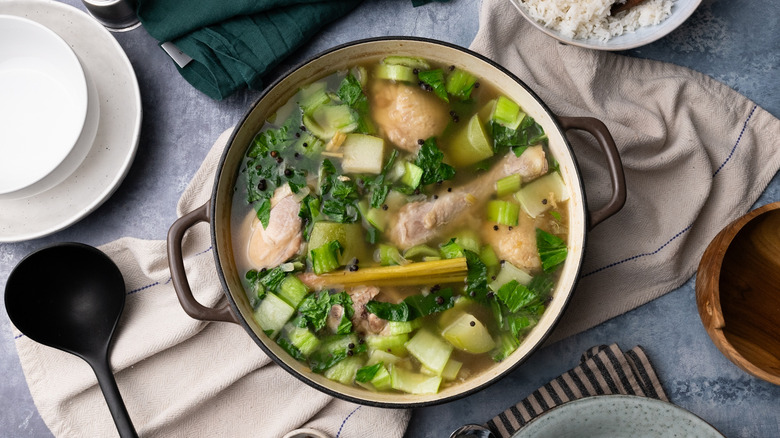 Tasting Table recipe developer Jennine Rye put together this recipe for tinola, a Filipino soup dish known for its light yet comforting quality. Wonderfully succulent chicken pieces are cooked in a warming broth flavored with ginger. Onion, garlic, peppercorns, and lemongrass add to the light yet aromatic flavoring, and fish sauce adds a richly savory and salty note. Finished off with chayote and bok choy, which add vibrancy and texture to the dish, this chicken tinola soup is both soothing and highly satisfying. If chicken soup is your thing, you can't get better than this Filipino classic. Read on to find out just how easy it is to make.