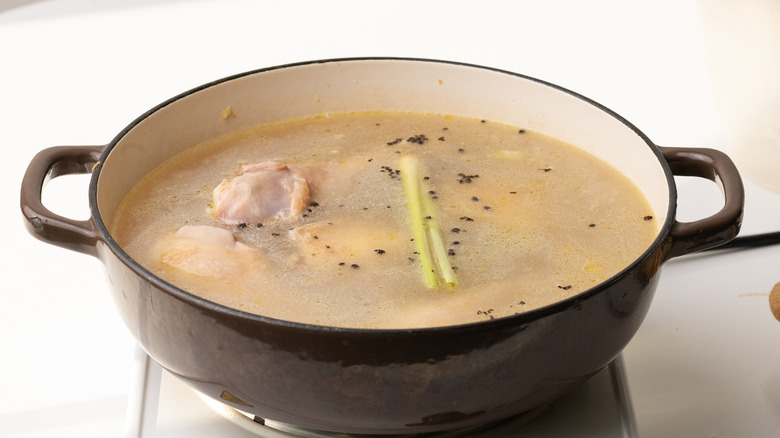 - Add the reserved rice water, lemongrass, and peppercorns. Simmer, uncovered, for 30 minutes, or until the chicken is cooked through.