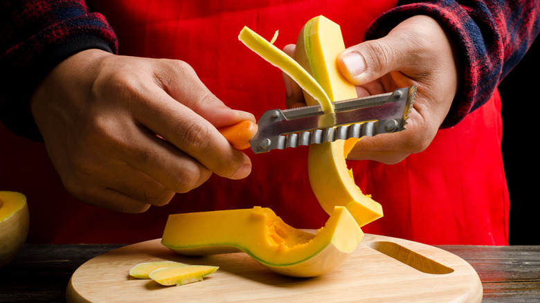 Delicata squash doesn't require any peeling beforehand either. As the name suggests, delicata squash has a supple skin that's cooked quite easily. When sliced, the squash forms curved rings that can be sauteed, causing the skin to soften as the flesh becomes sweeter. Cover the squash in your favorite warming and smoky spices and heat it in olive oil until the flesh begins to brown.