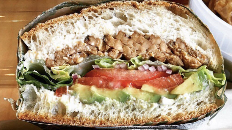 Whole Foods Market is known for its fresh produce, organic grocery options, and plant-based items to make your groceries more health-conscious. It's no surprise, then, that their trendy sandwich is the TTLA, a vegan option that uses tempeh bacon and adds avocado. What you need to know about tempeh is that it's made from fermented soybeans and it is rich with protein, perfect for anyone who doesn't eat meat. That's why we find it on this vegan BLT — TTLA stands for tempeh bacon, tomato, lettuce, avocado — and why this sandwich is the perfect lunch alternative for vegans and vegetarians. The TTLA started trending in 2018 when a TikToker named Tabitha Brown posted a video taste-testing the sandwich and absolutely loved it.
