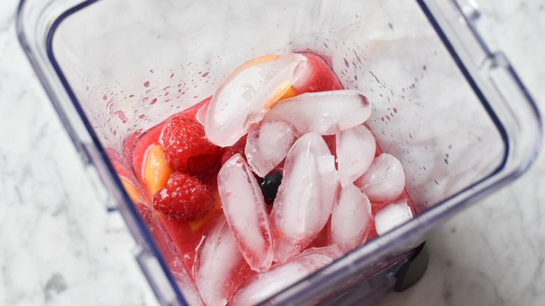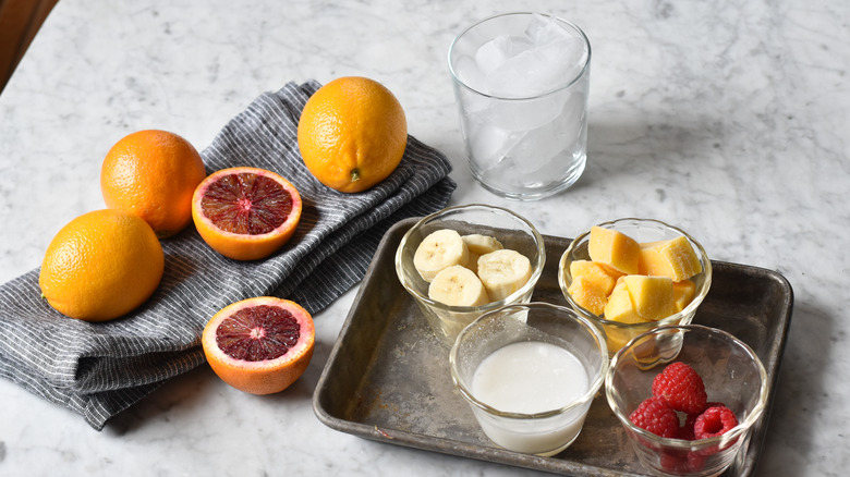 The ingredients list for this blood orange tropical smoothie is short and simple. You'll need 4 blood oranges to make up ½ cup of fresh juice, and some coconut milk (or another milk of your choice). If you can't find fresh blood oranges in your area, simply swap in ½ cup of blood orange or another citrus juice! Blood oranges are more commonly available now than a few years ago, though, so they shouldn't be too hard to find. You'll also need half of a ripe banana, cubed mango, and raspberries. Fresh or frozen fruit will work equally well here. Lastly, a cup of ice will be added to the mix to chill and thicken the smoothie.