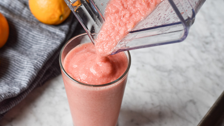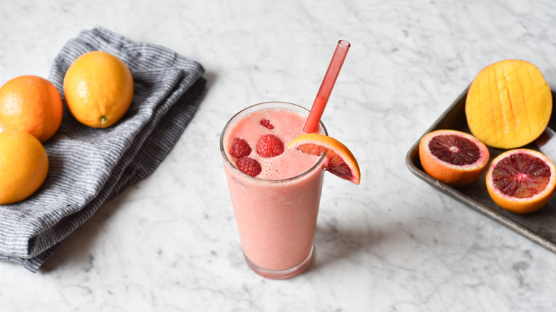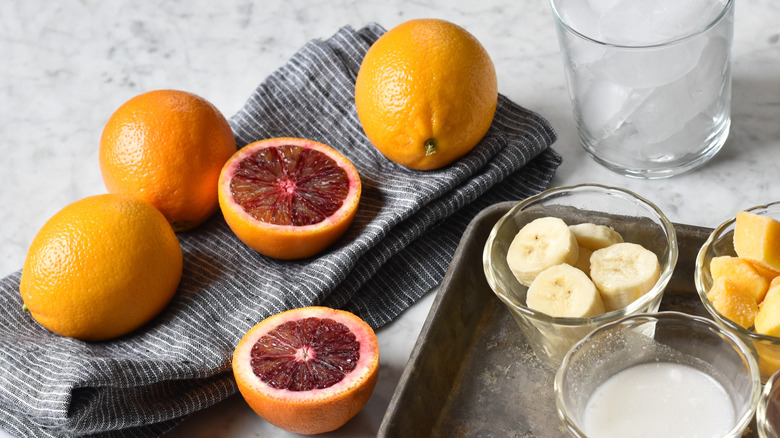 If you can't find blood oranges or a bottle of their juice in your local grocery stores, there are plenty of substitutes that will work in a pinch. Obviously, blood oranges are oranges at the end of the day. They are typically a bit sweeter than the average orange, with a darker color and floral scent. Tangerine juice in particular would be a great substitute in this tropical smoothie recipe, given its sweet and less acidic qualities. Regular oranges, fresh or pre-bottled, would work absolutely fine, also.