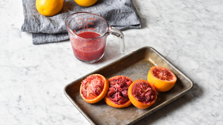 - Halve and juice the oranges, reserving one slice of orange for garnishing. Measure out ½ cup of juice.