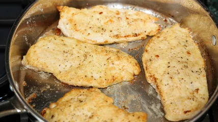 The kitchen term for this dusting of starch is dredging, and the technique works with a range of flours, including almond or coconut flours, gluten-free flour, and even cornstarch and potato starch. Dredging is a classic technique for recipes such as chicken piccata and delicately fried fish, and is also sometimes used when browning stew meats. The process is simple, but there are a few counterintuitive tips to remember. The flour should be a dusting, not a thick coat, so you'll want to pat the chicken dry before dipping the protein in the flour and then gently shaking off any excess. This is one time you shouldn't season the chicken with salt first because salt draws moisture to the surface, and you'd be patting it off. Just season the flour instead, or salt the dish after cooking.