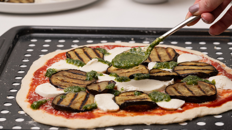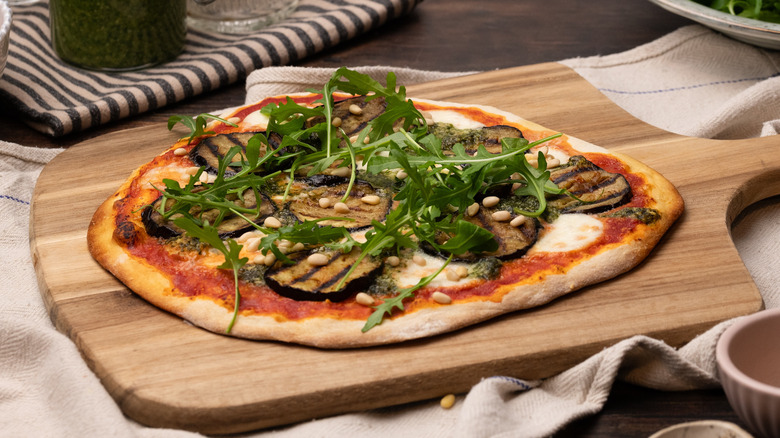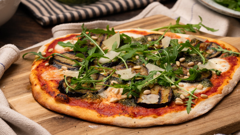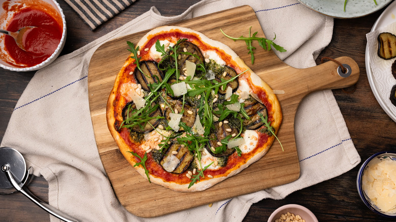 This cheesy eggplant Parmesan pizza recipe, created by Tasting Table recipe developer Jennine Rye, is inspired by another classic Italian dish; eggplant Parmesan. The combination of fried eggplant, tomato sauce, Parmesan, and mozzarella is a match made in heaven for vegetarians and meat lovers alike. The pizza is made using a thin dough base, which is topped with tomato passata, pan-fried eggplant, and fresh, creamy mozzarella. It's finished off with a drizzle of homemade pesto and a sprinkling of Parmesan before being oven-cooked to crisp perfection. Served with pine nuts, Parmesan shavings, and peppery arugula, this eggplant parmesan-influenced pizza recipe is a perfect tribute to Italian dishes and flavors.