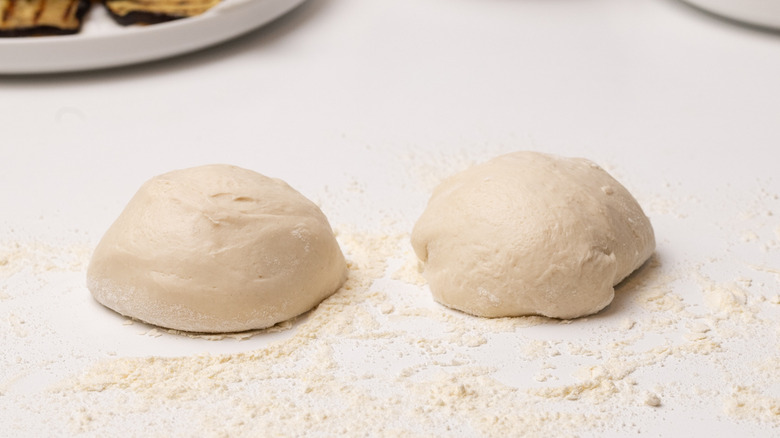To prepare the pizza, divide the dough into two evenly sized balls.