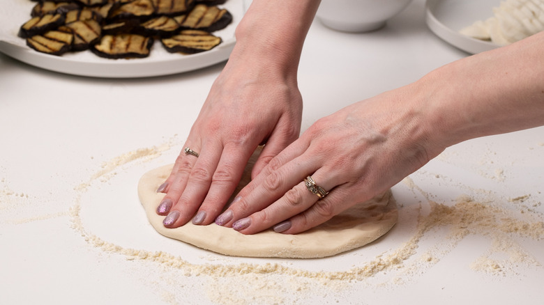 - Flour a clean surface and then roll out the dough or use your hands to shape it into two roughly round shapes.