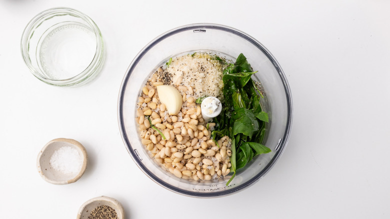 - Add the basil, ⅓ cup pine nuts, ⅔ cup olive oil, ⅓ cup grated Parmesan, garlic clove, sea salt, and black pepper to a food processor.