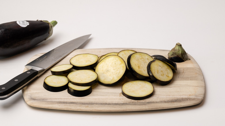 - Fry the eggplant slices for 3 to 4 minutes on either side until they are seared and soft.