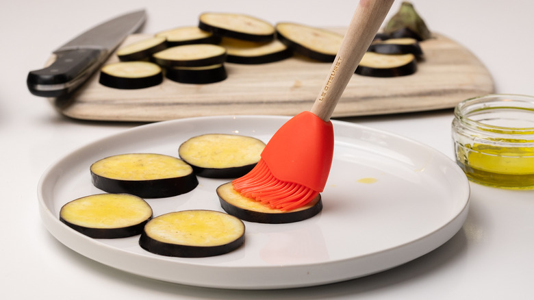 - Brush both sides of the eggplant rounds with the remaining 2 tablespoons of olive oil.