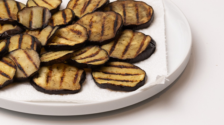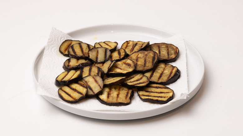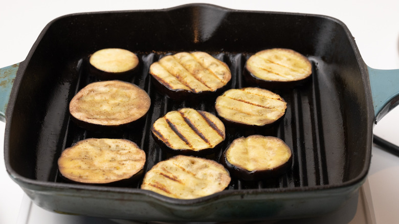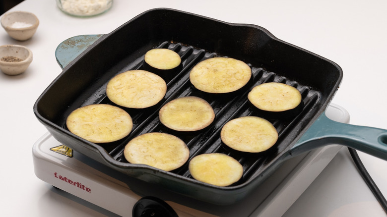 - Heat a cast iron griddle to medium-high and place the eggplant rounds on the hot griddle.