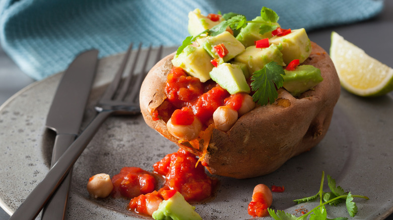 There are a few ways to use avocado as a topping for a baked potato. To match a similar creaminess of sour cream, smash the avocado or make Tasting Table's crave-worthy guacamole with diced tomatoes and onions for more flavor and texture. Diced avocado works if you prefer small chunks of the creamy fruit and sliced avocado is just right for when you want bigger pieces in each bite. Use any of these techniques with the fiber-rich ingredient to turn your baked potato from a boring side dish into a full meal or loaded snack that's also dairy free and vegan friendly. And in case you're wondering, avocado works equally well with baked sweet potatoes or the traditional Russet and Idaho varieties.