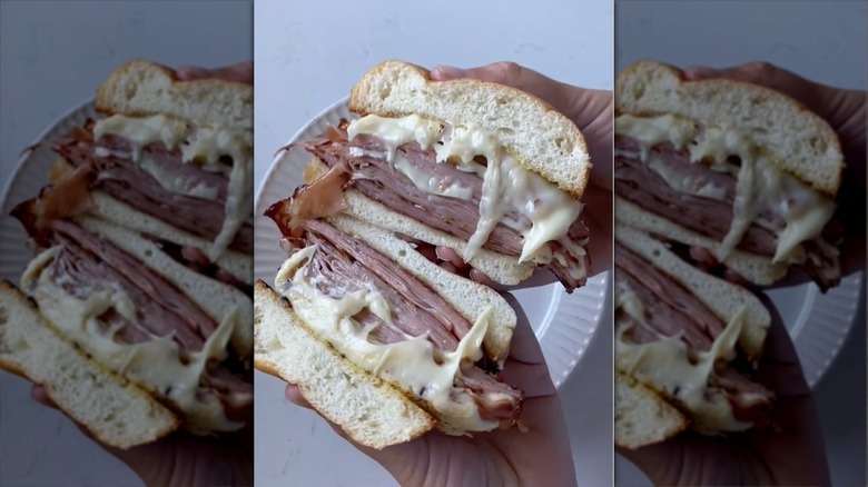A New Yorker through and through, Bourdain's sandwich starts with a Kaiser roll much like the kind you'll find encasing other sandwiches in the city's numerous bodegas. Mortadella is the star and here, you need two or three slices, which get heated through and crisped on the edges in a pan or on a flat top griddle. Once the mortadella has some color, top it with a slice or two of provolone and let the cheese melt over the meat. Toast the split Kaiser roll a bit in the same pan then spread the opposing sides with Dijon mustard and mayonnaise, add your meat and cheese, and enjoy. The fat of the meat and cheese will soak into the bread along with the mayonnaise as it yields under the heat with the Dijon adding the perfect piquant counterpoint.