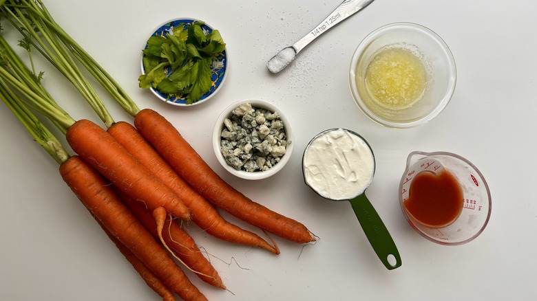 The Buffalo sauce in this recipe is made from a simple combination of salted butter and hot sauce (Le Moing says she uses Frank's RedHot, but another Louisiana-style hot sauce would also work.) You're also going to need carrots and salt for this recipe, as well as sour cream, crumbled blue cheese, and celery leaves for the topping.