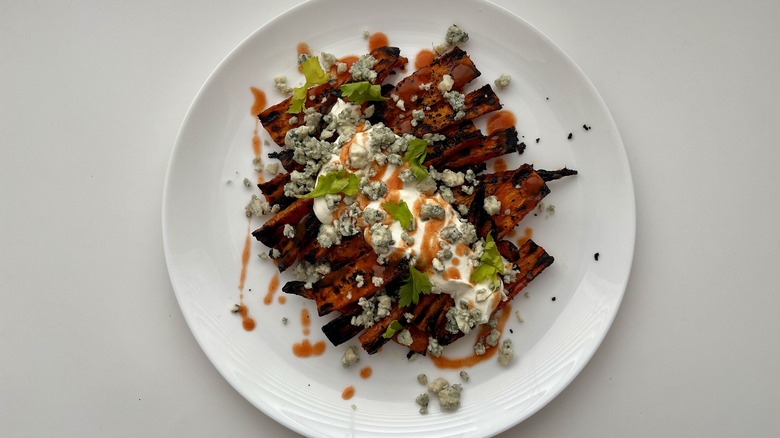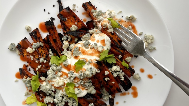 Once the carrots are cooked, Le Moing likes to pile on some toppings. Sour cream, she says, "not only tames the heat but also adds a delightful creaminess to each bite," while blue cheese crumbles are reminiscent of the blue cheese dressing, a classic dipping sauce for Buffalo wings. Even the chopped celery leaves she sprinkles on top are a nod to the celery sticks frequently found as a wing side. This green garnish also makes for what Le Moing calls "a visually stunning dish."