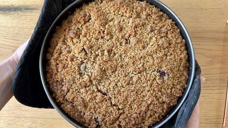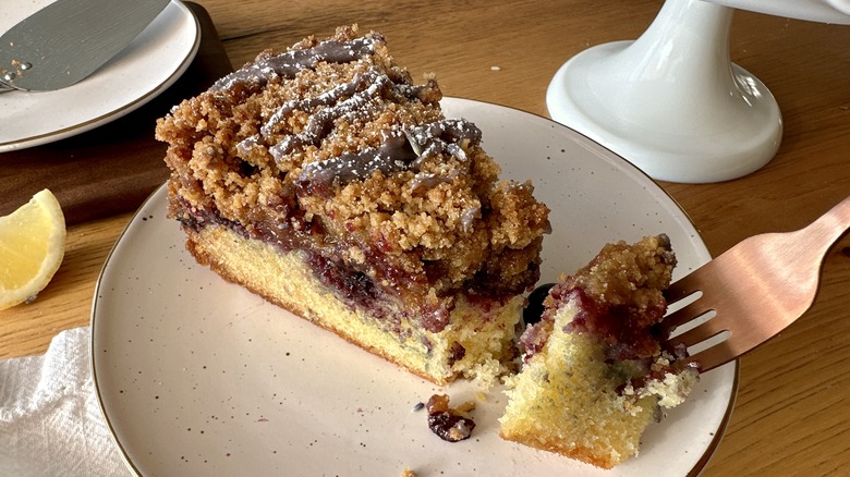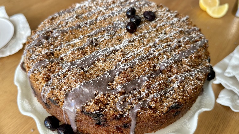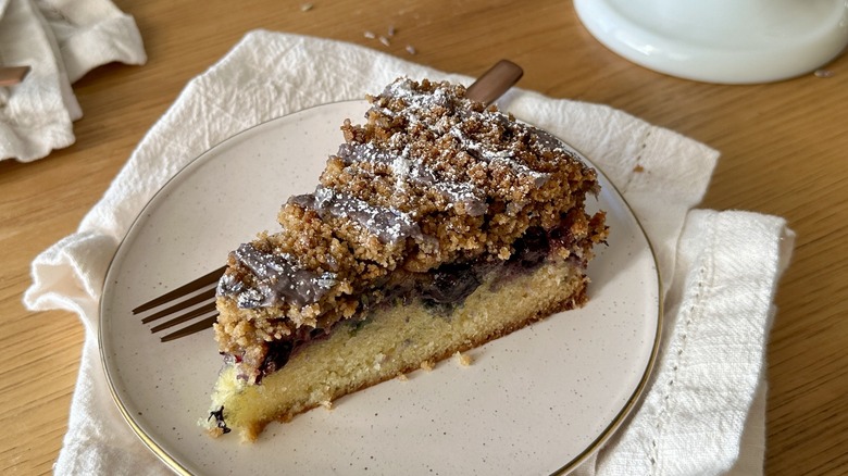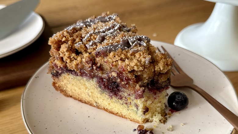If you're making this coffee cake when blueberries aren't in season, don't hesitate to grab a bag of frozen blueberries at the supermarket — this cake can be made with either fresh or frozen. If using fresh blueberries, make sure to give them a taste before using. If the blueberries are a little too tart, sprinkle in some sugar when coating the blueberries with flour for additional sweetness. If bland, add a squeeze of lemon juice to brighten them up.