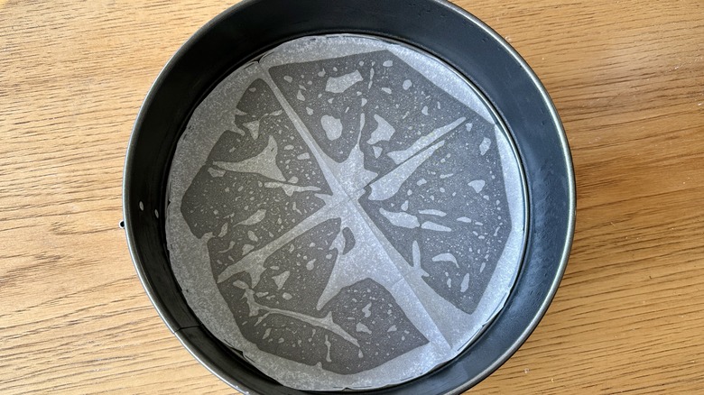 - Line a 9-inch round cake pan with cooking spray and parchment paper. Set aside.
