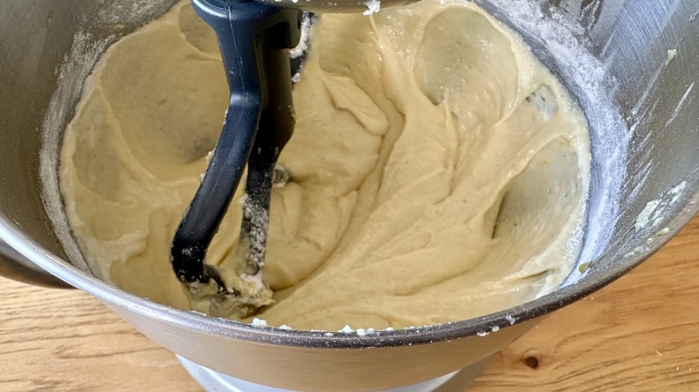 Add eggs one at a time, mixing until each is combined with the creamed butter and sugar. Scrape down the bowl with a rubber spatula after each addition if needed.