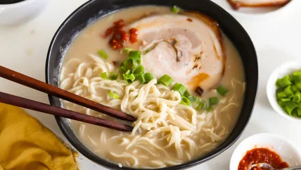 Next, boil the bones again, this time over low heat along with charred vegetables. A final step to achieving the silkiest and most unctuous tonkotsu broth is to strain it, then emulsify it with an immersion blender until it's frothy. If you don't have an immersion blender, you can always use a standard blender. For added flavor, chefs and home cooks also commonly char or roast the meat bones after soaking and cleaning them.