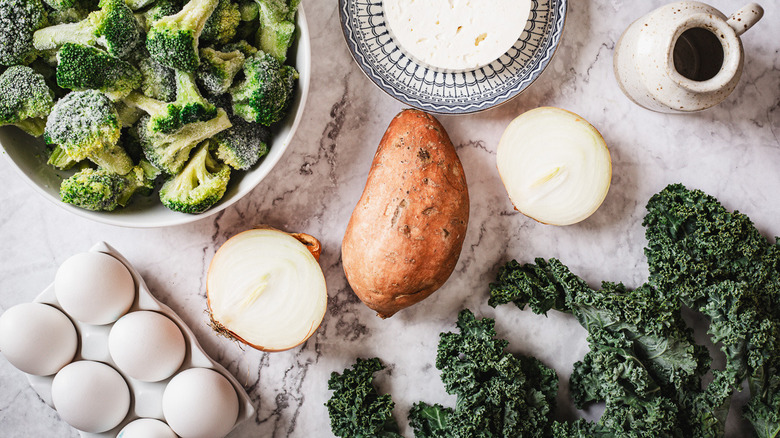 Gather the ingredients for this winter vegetable egg scramble recipe
