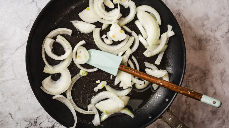 - Add the sliced onion and saute on medium heat for 5 minutes, until it starts to change color.
