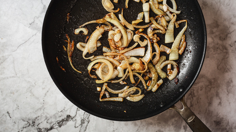 - Lower the heat to low and continue cooking the onion for 10 minutes, until it caramelizes.