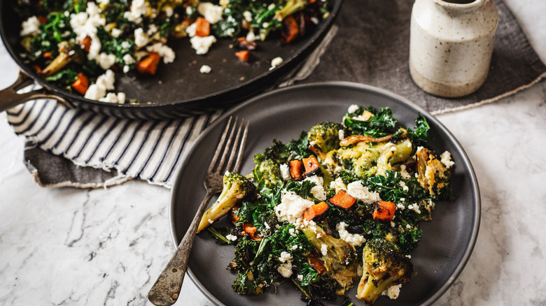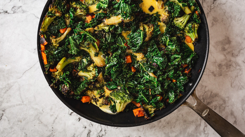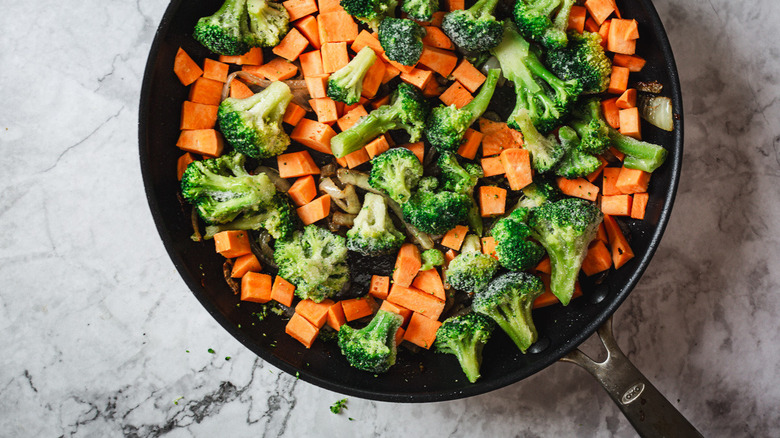 - Add diced sweet potato and broccoli florets to the skillet. Saute for about 7 minutes, stirring occasionally, until starting to soften.