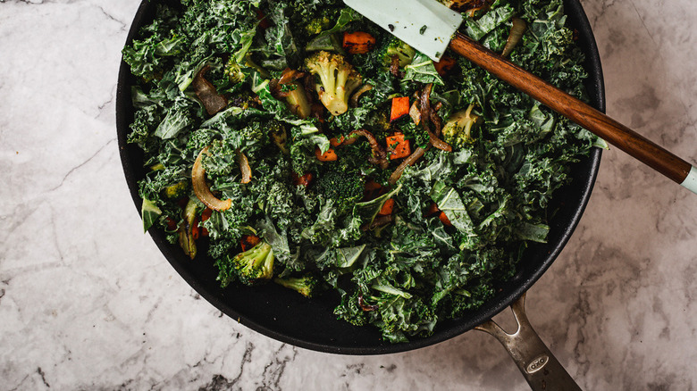 - Add the chopped kale, cover with a lid, and continue cooking for 5 more minutes, until the kale is wilted.