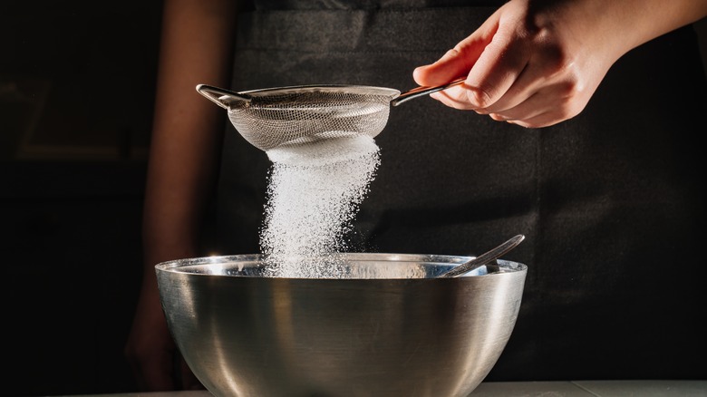 Once your butter is smooth and creamy, it may be tempting to start scooping powdered sugar right from the bag and piling it into the mixer. While this won't ruin your buttercream, it will increase the chances of it becoming lumpy, which will make things a bit challenging when it comes to actually decorating your cake. Powdered sugar has a tendency to clump together, so the most surefire way to avoid any clumps is to sift it beforehand — a somewhat tedious process, but one that will save you frustration down the line.
