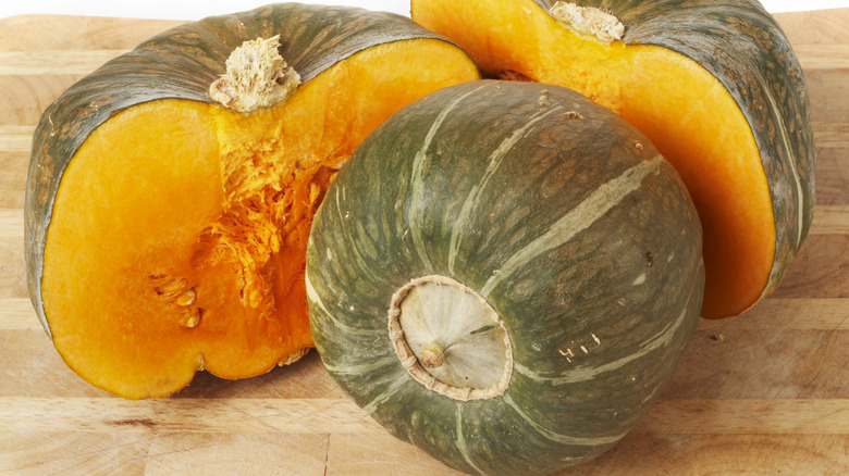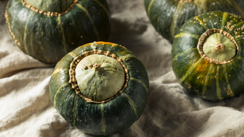 For this winter squash variant, getting picked from the vine halts its ripening process. That is why it's important to check what you're buying for signs of maturity. Aside from doing the tapping test on its rind that we mentioned earlier and checking that its stem has dried out, your buttercup squash should have a deep green peel that's matte rather than shiny. Avoid any that have moldy spots or sunken areas. Check its bump, too, for roundness and firmness. If it feels tender, then the squash is past its prime.