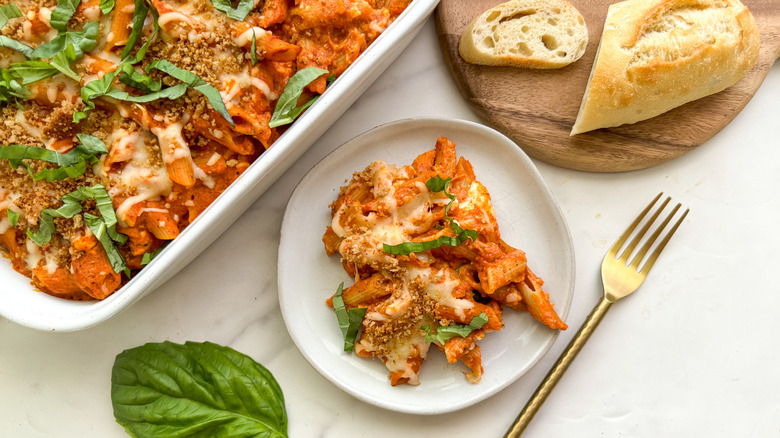Baked pasta dishes are the cream of the crop when it comes to comfort food meals. The baking process allows the flavors to intensify, creating a more complex and harmonious profile and allows the cheesy goodness to get into every nook and cranny of the pasta. We're elevating the sauce with roasted red peppers to add a hint of smokiness and lots of extra flavor, and topping this dish with butter toasted breadcrumbs to add a subtle crunch.