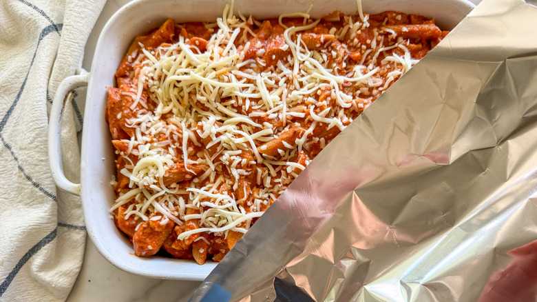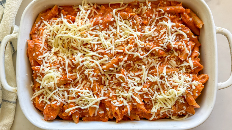 Add the pasta mixture to a 9x13-inch baking dish and top with mozzarella cheese.