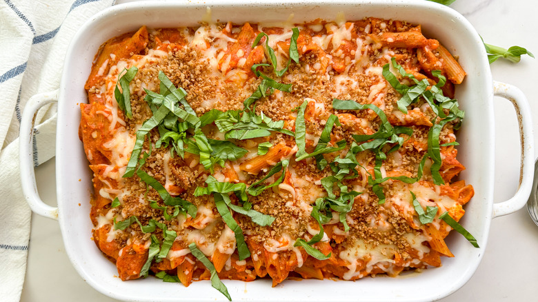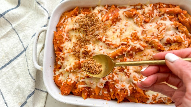 - Remove the pasta from the oven and top with the toasted breadcrumbs.