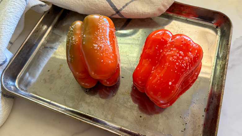 - Brush the whole red peppers with avocado oil and sprinkle with ½ teaspoon of salt.