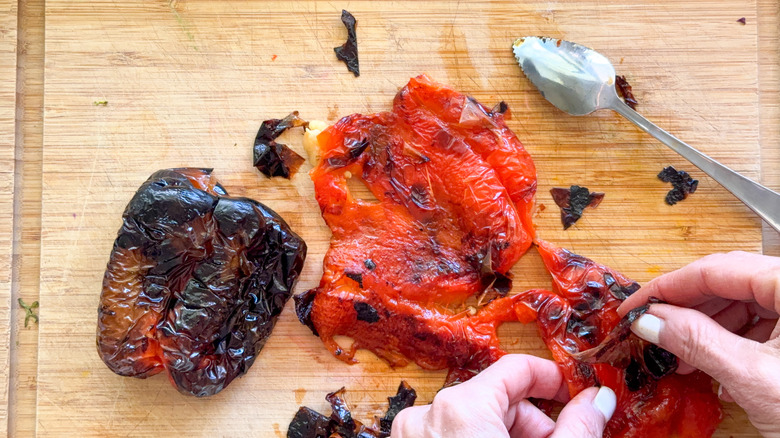 - Remove the red peppers from the oven, cool for 10 minutes, then peel and discard skin, core, and seeds.