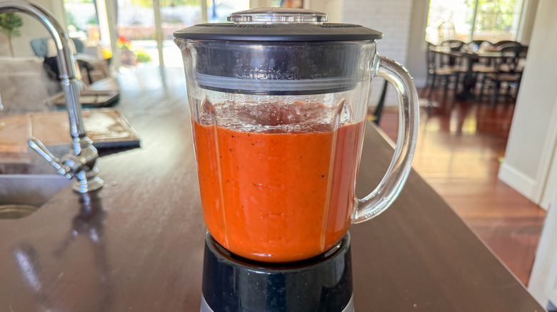 - Add the sauce and the roasted red peppers to a blender and blend until smooth.