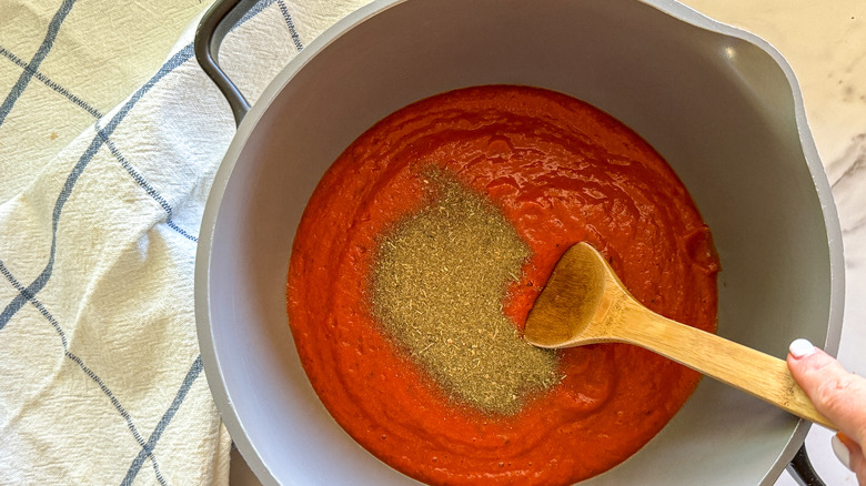 Add this mixture and the Italian seasoning to a large pot over medium heat.