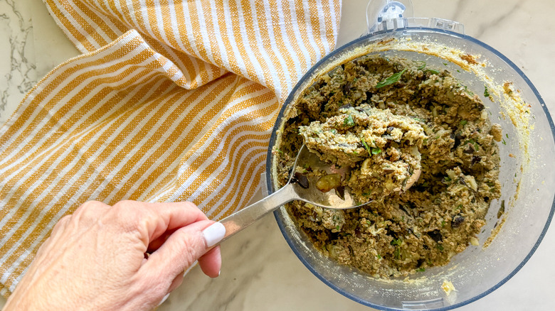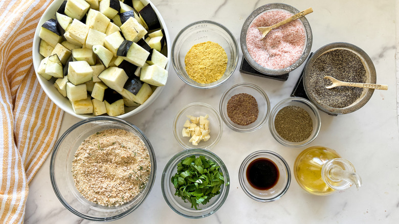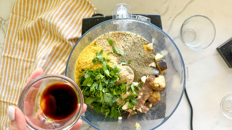 - Add the eggplant to a food processor along with the flax mixture, garlic, breadcrumbs, parsley, nutritional yeast, soy sauce, Italian seasoning, salt, and pepper.