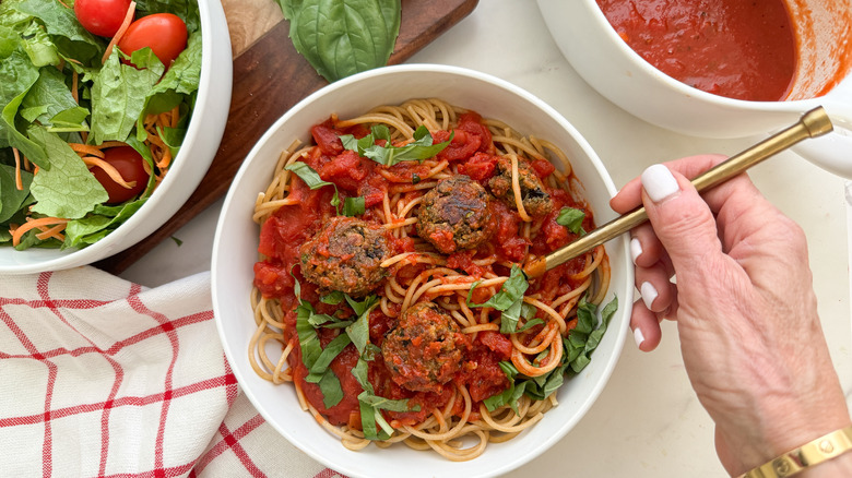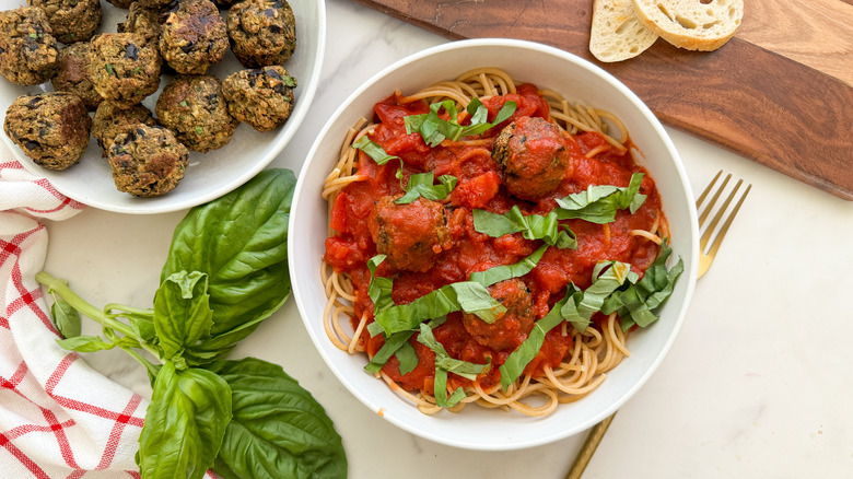 Wellness coach and recipe developer Miriam Hahn brings us this recipe and says, "Growing up in an Italian household, spaghetti and meatballs were a weekly dinner. Now that I don't eat meat, I love homemade plant-based versions that give you the same taste and texture as the real thing, and this blend of ingredients and method of preparation is spot on."