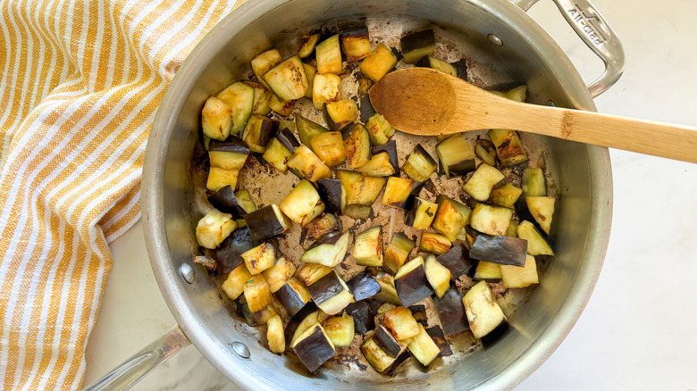 - Add the eggplant and ¼ cup water to the pan and saute for 8 minutes, stirring frequently.